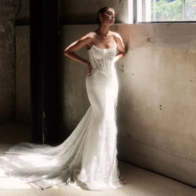A vision of grace crafted in shining crushed satin fabric, this gown embraces the light with a luminous radiance that reflects your inner glow. The square neckline adds a touch of modern sophistication, perfectly framing your collarbone and accentuating your natural beauty in a form-fitting silhouette that complements every curve.