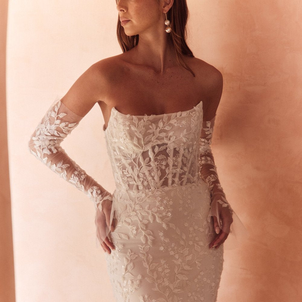 The Rubinette gown is demurely flirtatious with a hint of seduction. A structured bustier is softened by swathes of lace, and hints of sparkle shine as you move.