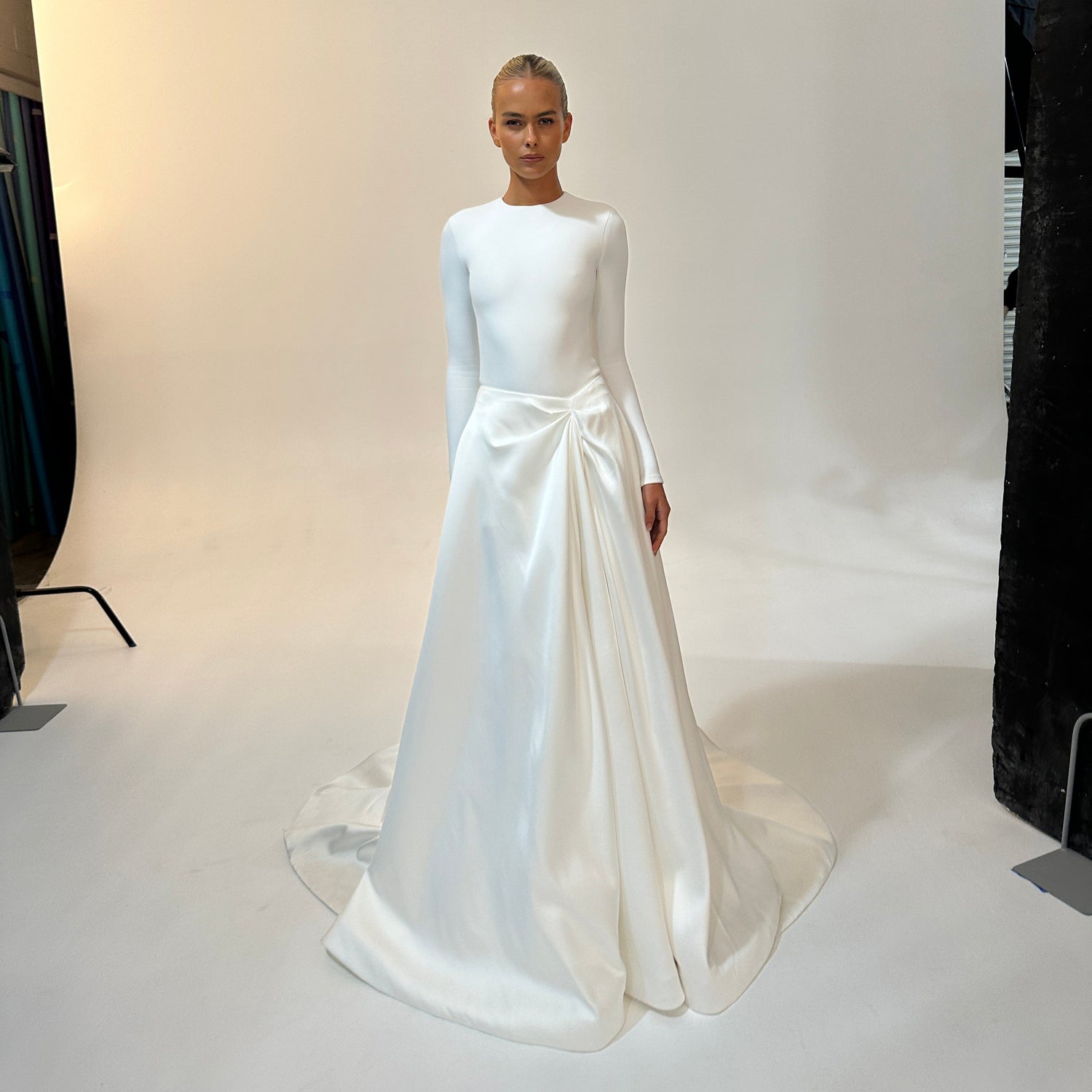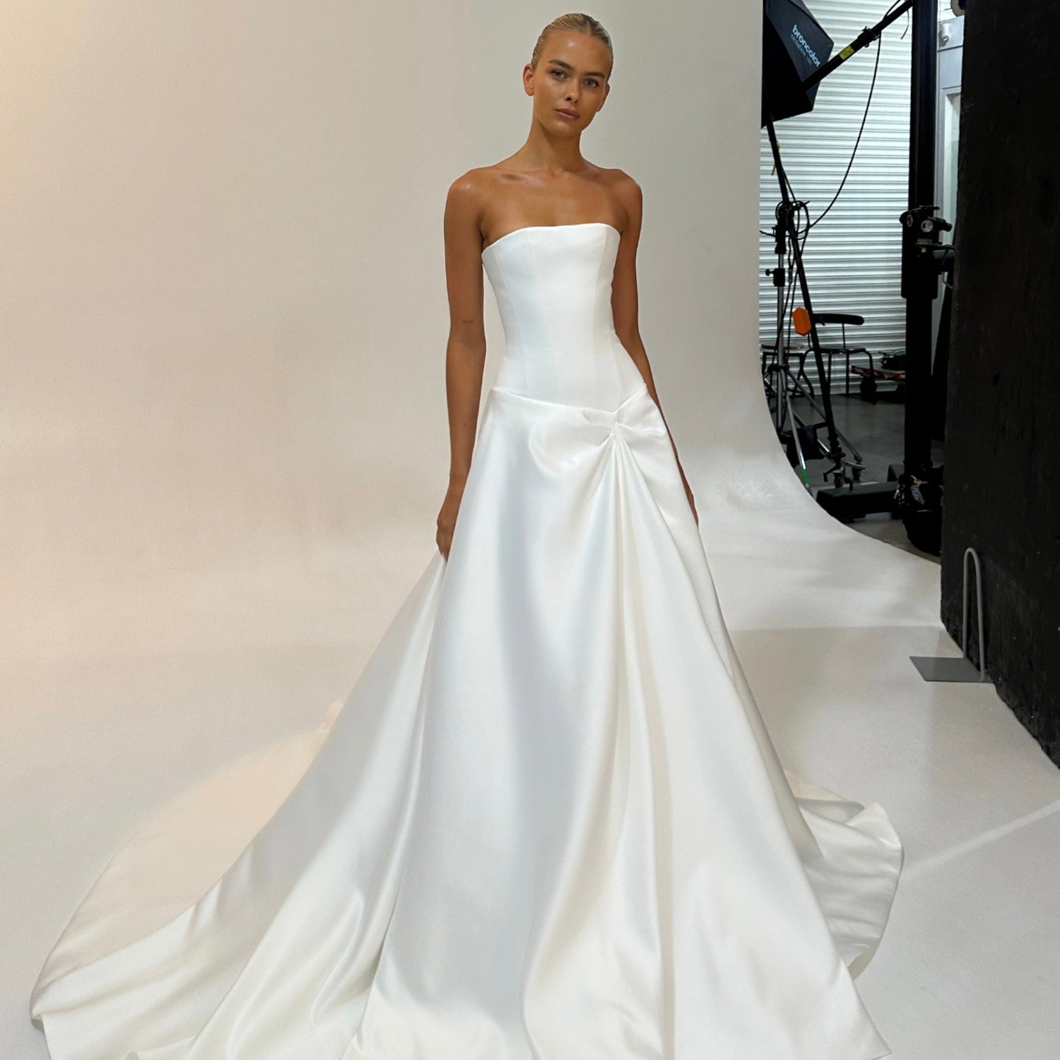 This season's minimalist must-have is Lunette. Crafted from luxe double satin, Lunette is the ultimate conceal-reveal moment thanks to its effortless drape detail across the bodice, paired with an unexpected low and open back. Channel the nineties with the sleekest in first or second looks, thanks to the option of a full train or puddle train.