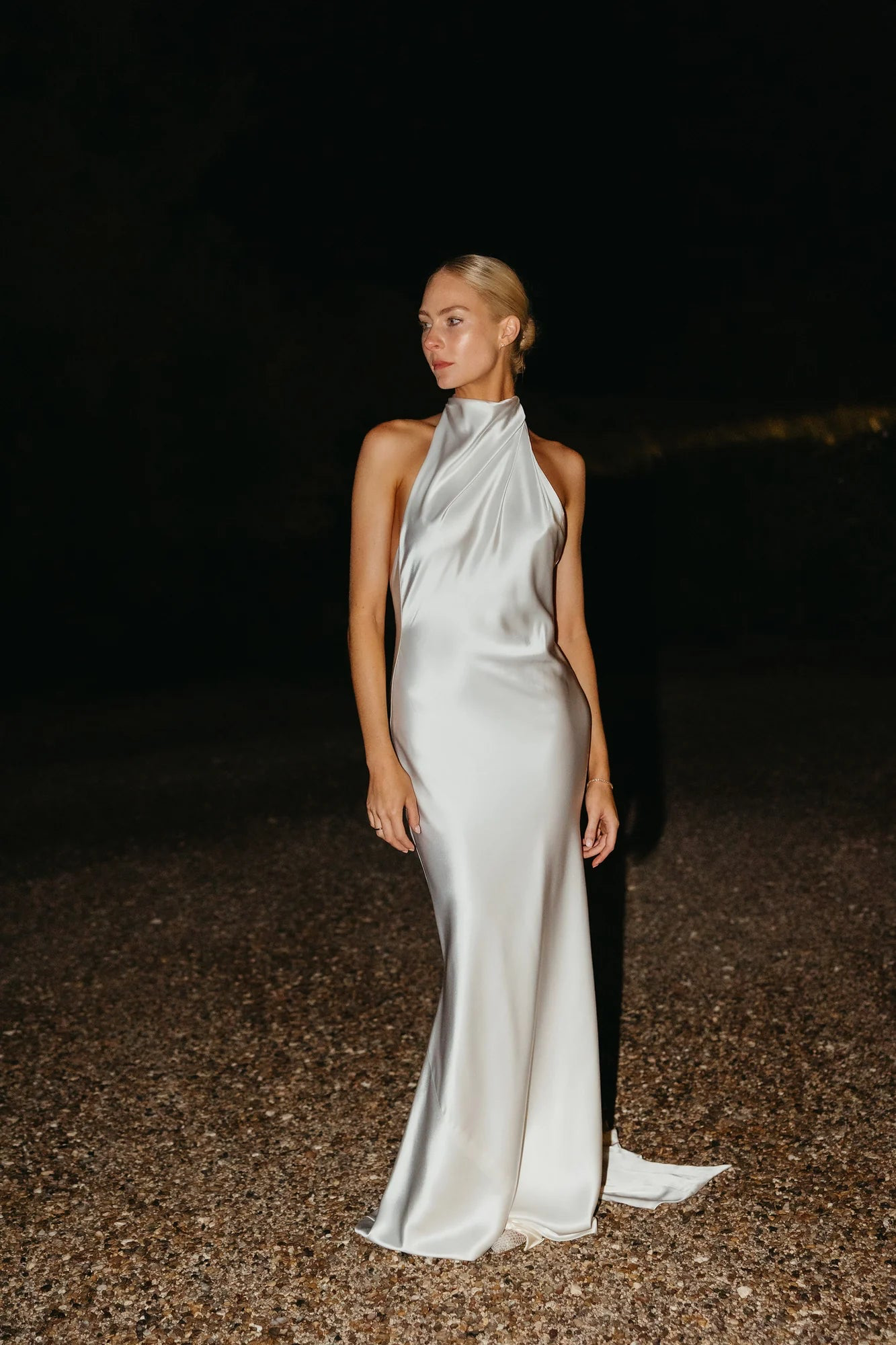 For minimalism with main character energy meet Cameron. Fluid draping from the halter neck falls effortlessly into a relaxed silhouette. Crafted from satin triacetate, Cameron’s showstopping low back is celebrated via its long ties at the neck.