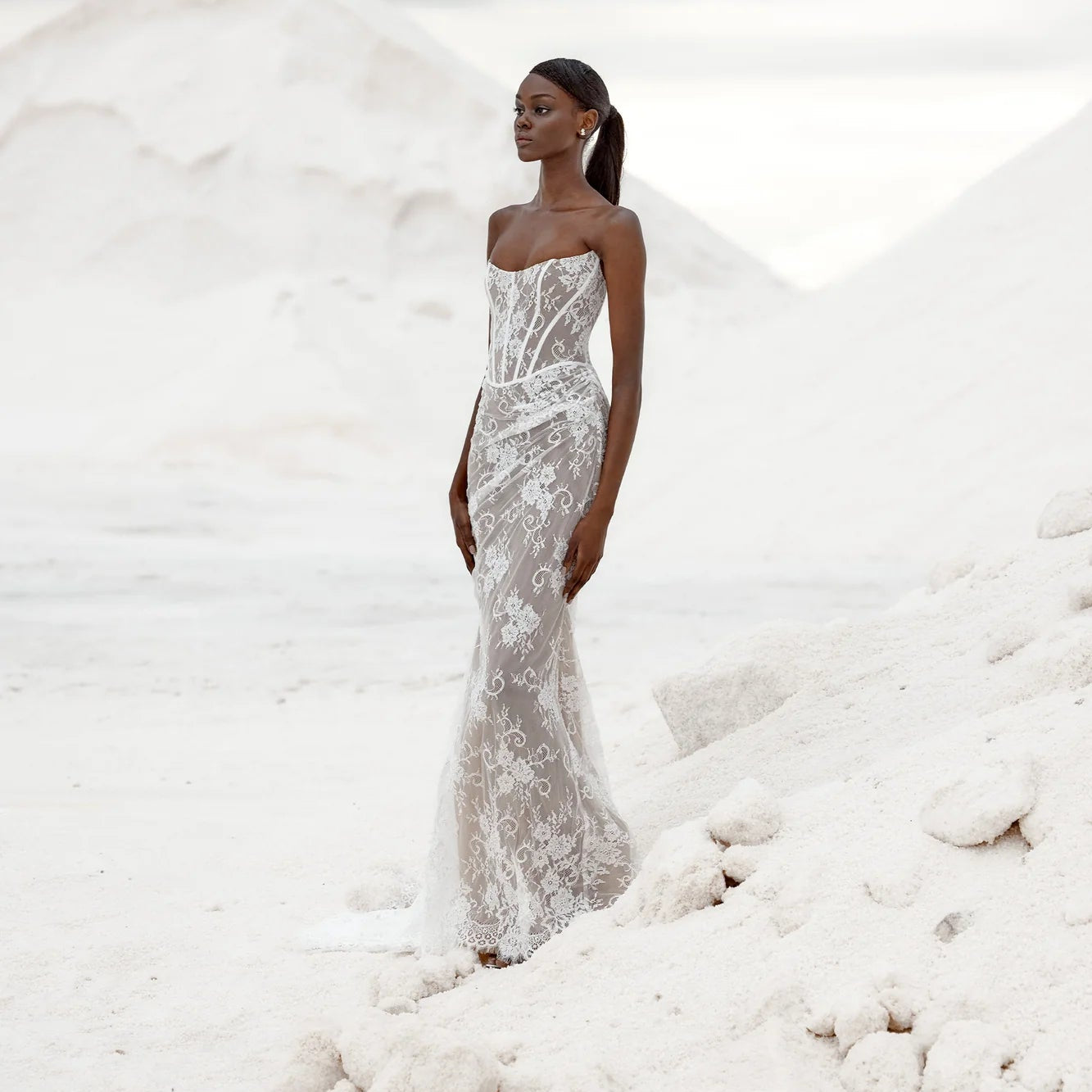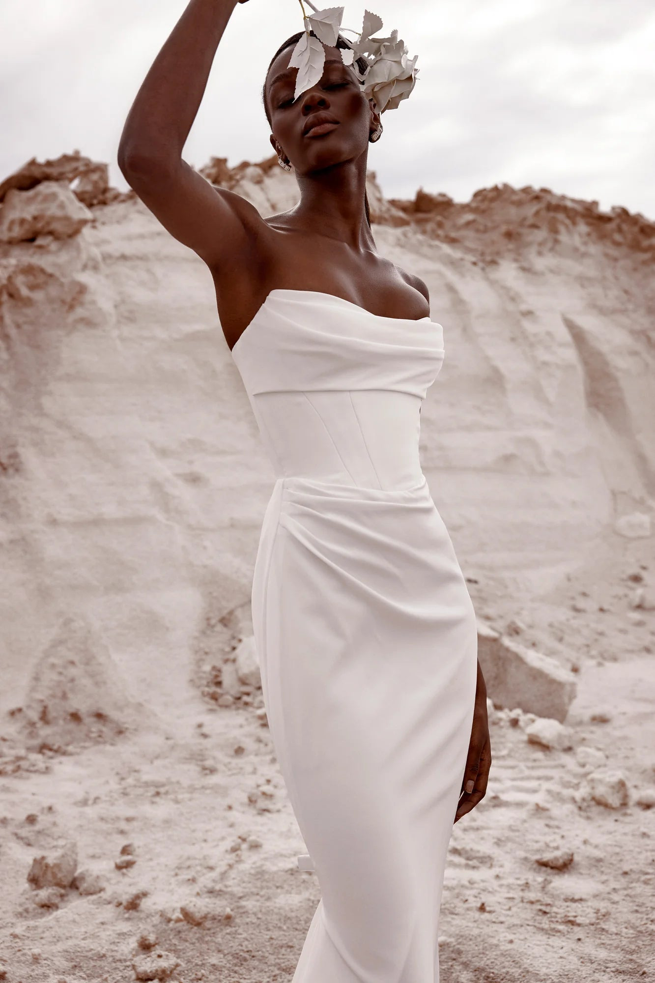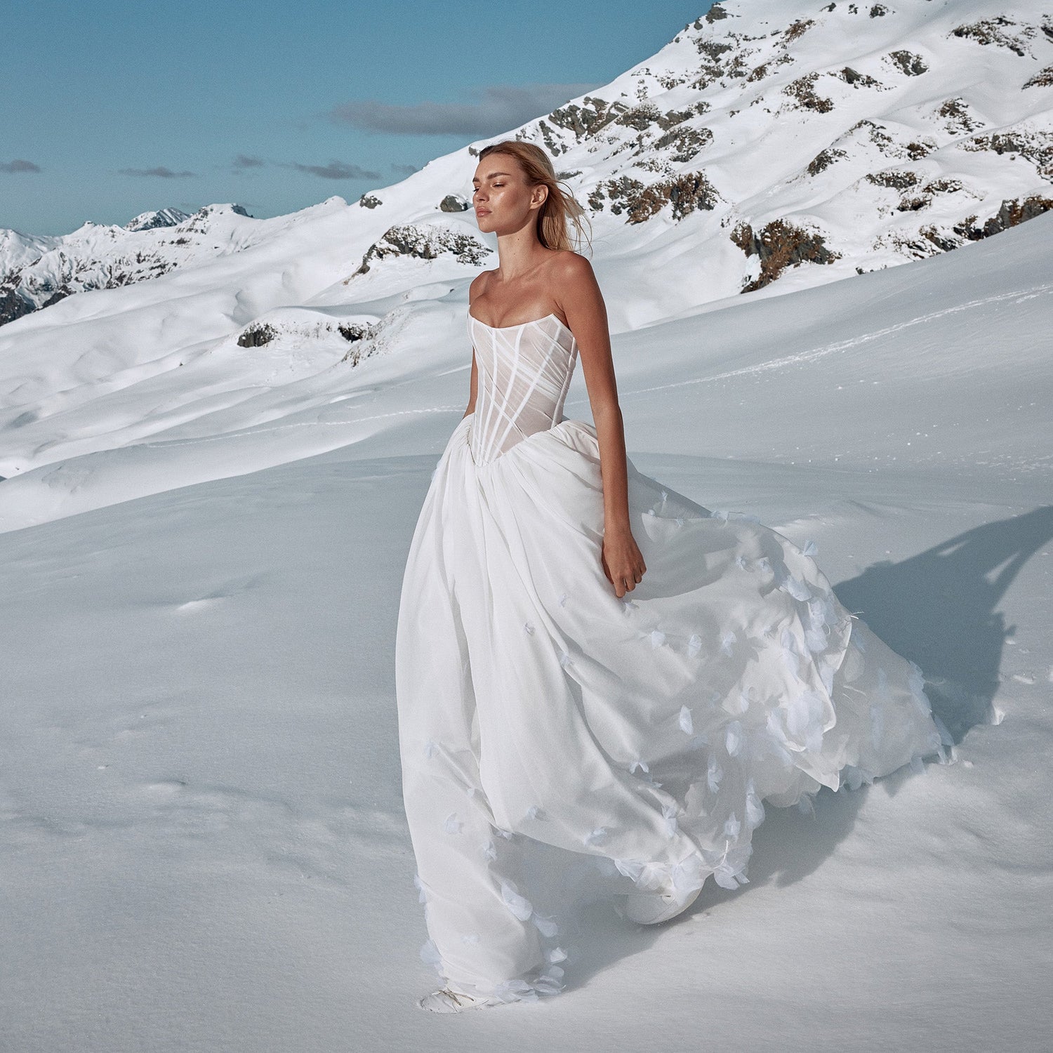 Basking in the textural beauty of Meribel. Blurring the lines between modernism and romance, Meribel's scoop neckline, directional corsetry detailing and directional draping brings a dichotomous edge to the ethereal layering of its A-line skirt. Abstract floral detailing delivers texture and moment, whilst the exaggerated hip plays on proportions to showstopping effect