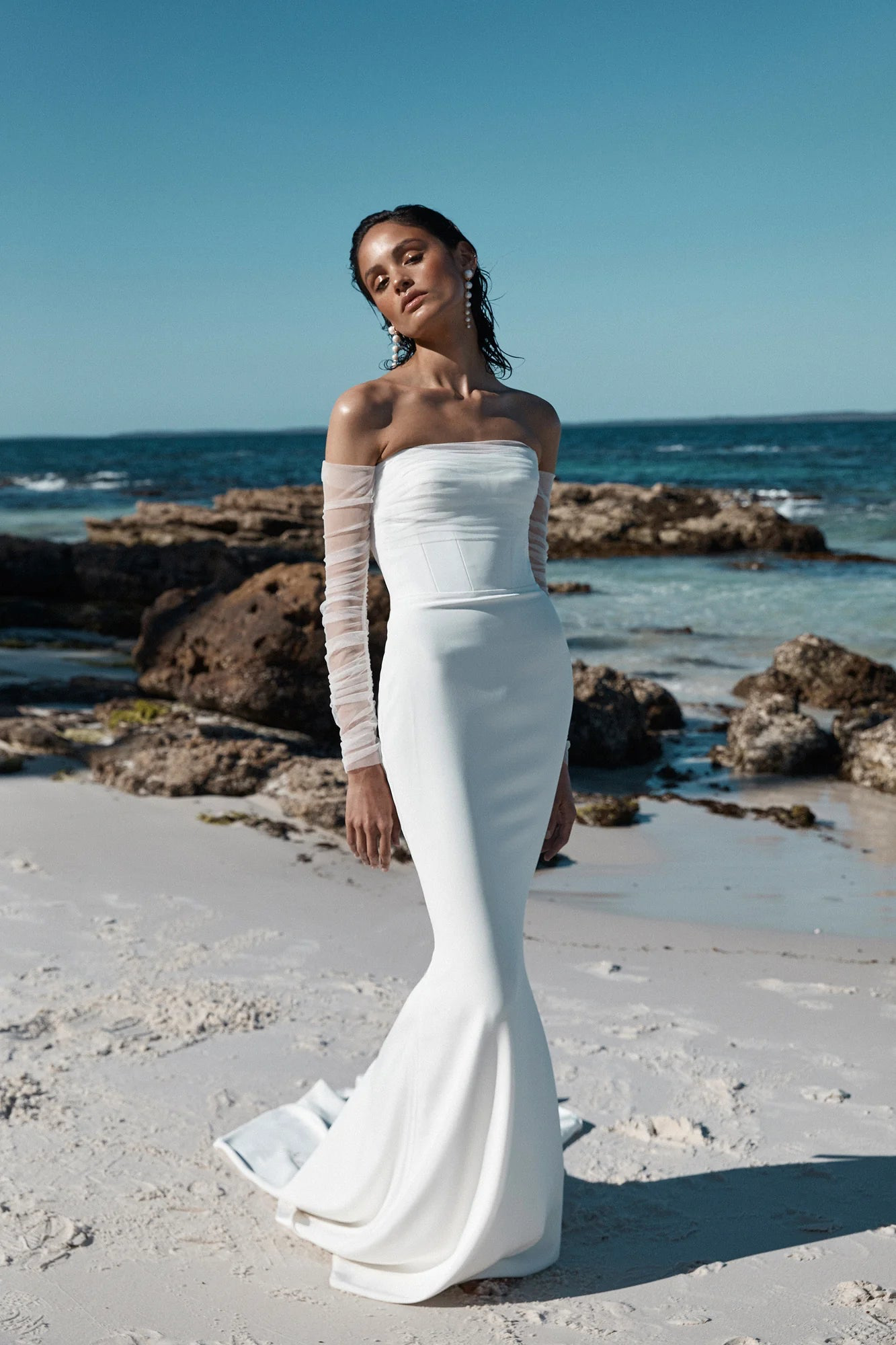 Move over screen sirens, Berkeley has arrived. Perfect for a statement red carpet or walk down the aisle, to Berkeley's deep v neckline, off shoulder arm band detail and fit and flare skirt will steal every scene. Pair with the Echo skirt for level-up drama.