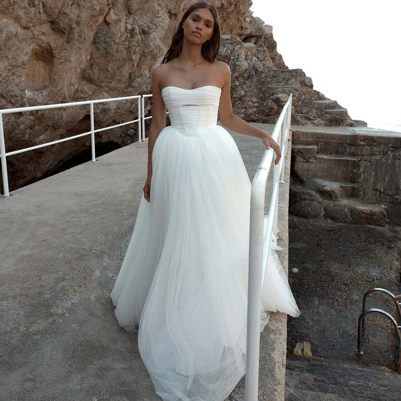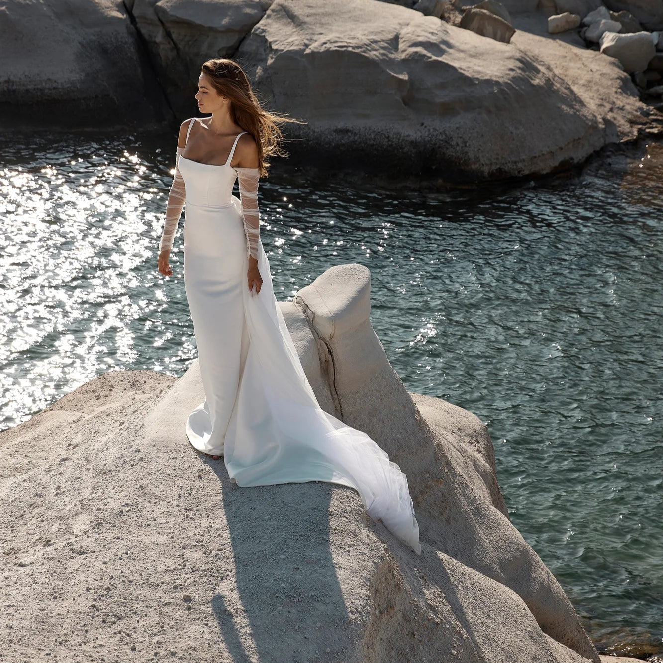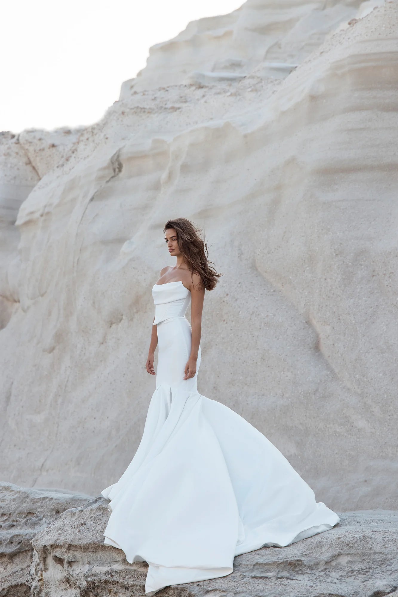 Made for minimalists, Ziva is a lesson in pared-back cool. Hand draped tulle wraps thebust and into a dipped back neckline, finished with ruched tulle sleeves. A structured bodice with a soft sweetheart neckline creates a flawless fit.