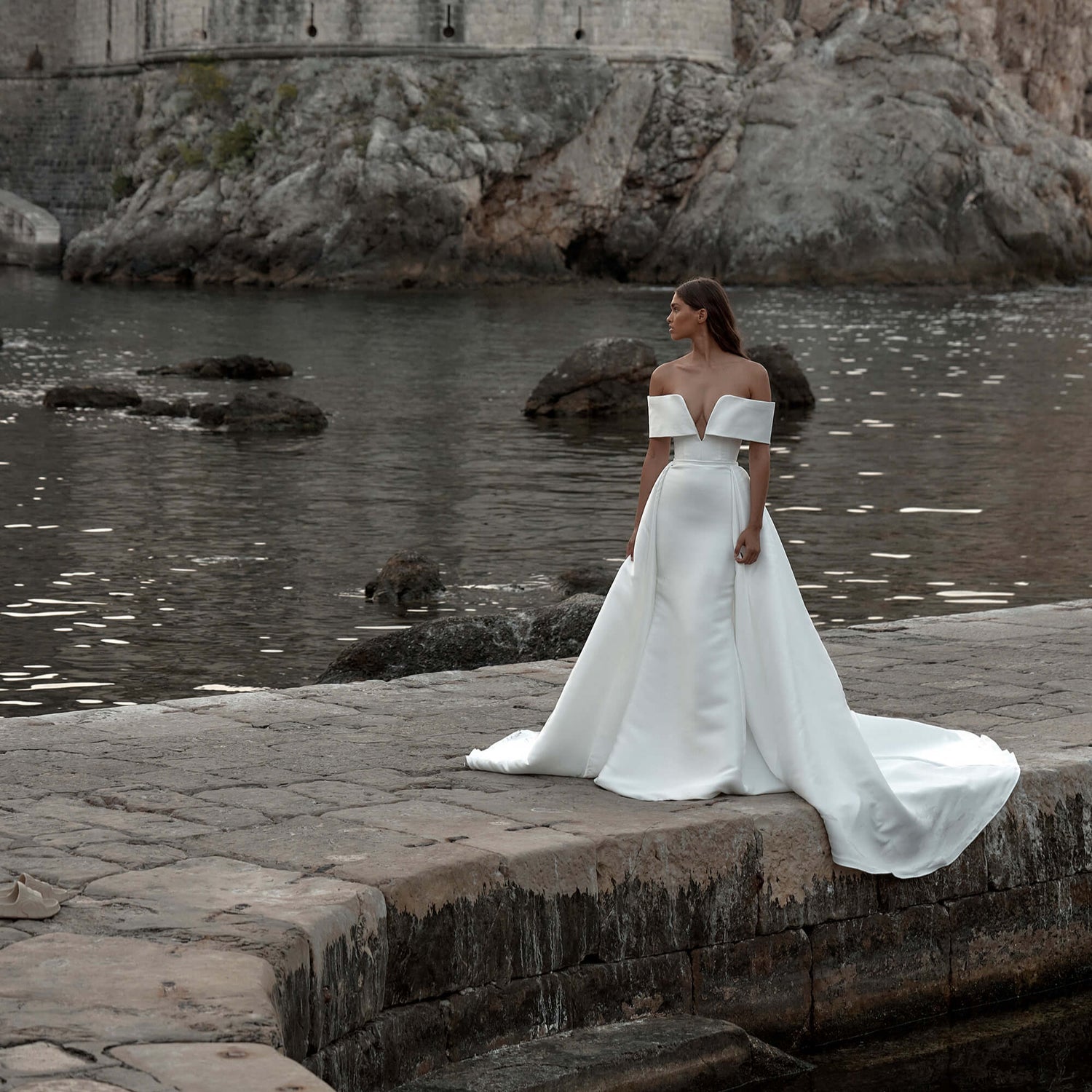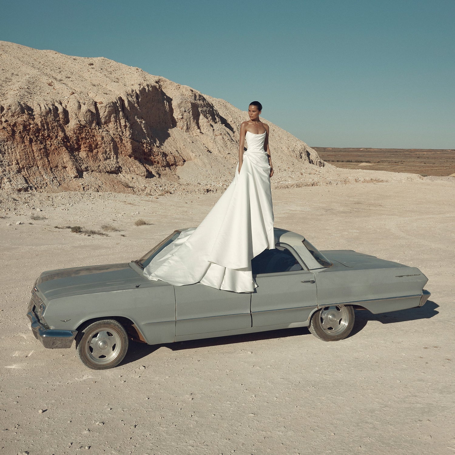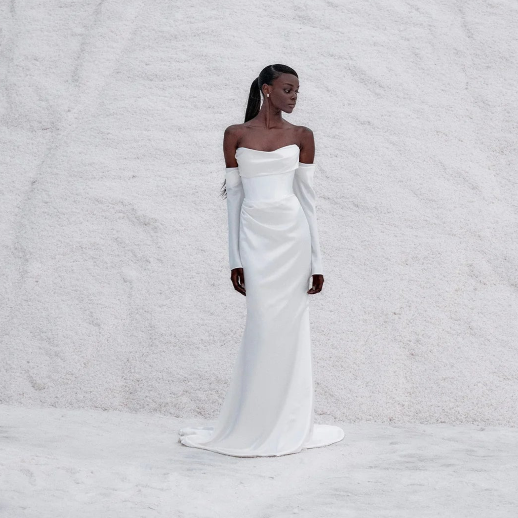 Noughties minimalism reboot à la Fox. An off-shoulder, relaxed fit and flare silhouette cut from a luxe double satin delivers Y2K style goals. Ideal for a pared-back first look or sleek second, Fox delivers elevation and effortless in equal minimalist measure.