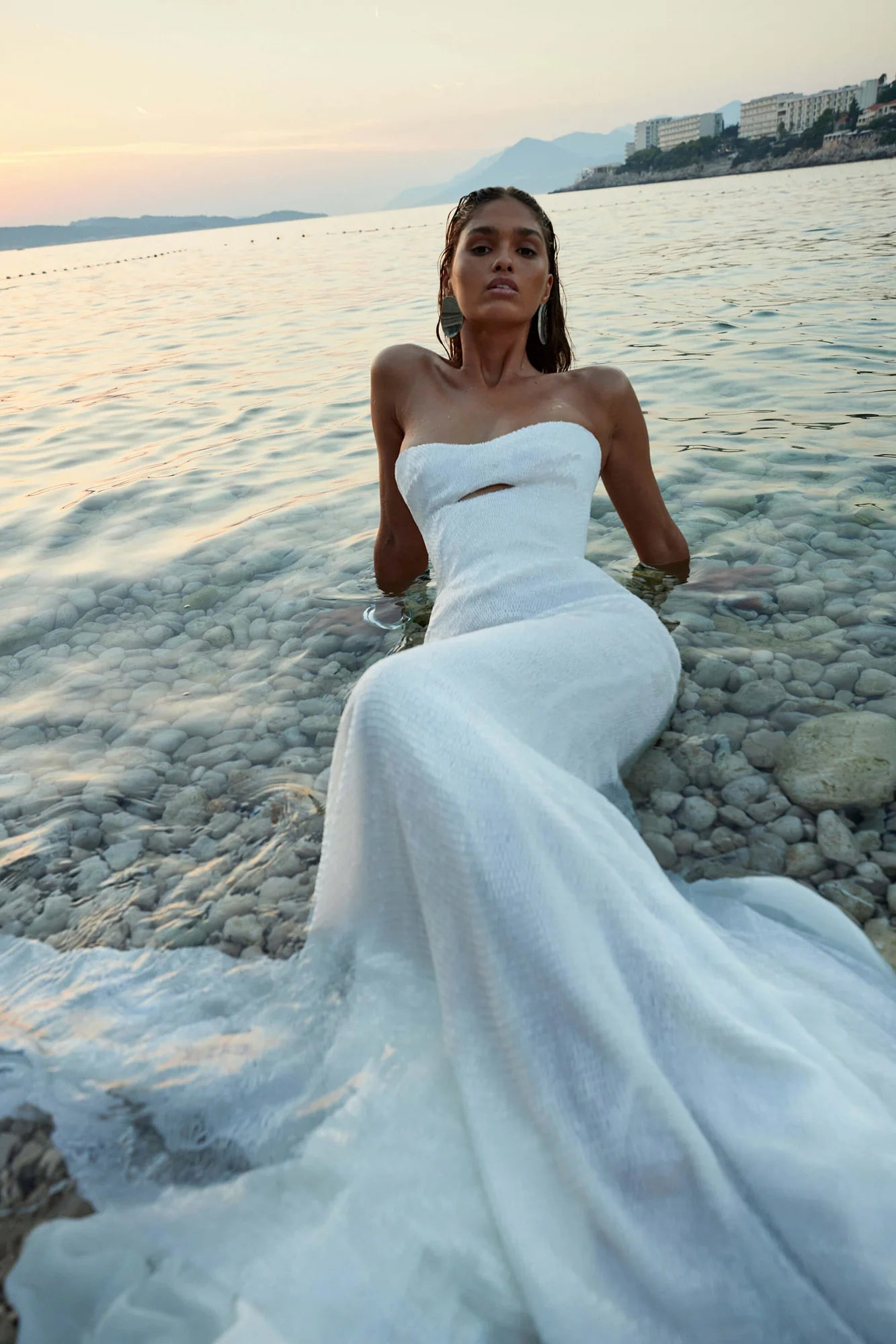 Every hour is golden hour in Nile. Nile shines thanks to its bespoke Chosen by KYHA lineal beading, a structured, corseted bodice with cut away detail and dipped waist. Complete with fit and flare skirt, Nile is a modern icon in the making.