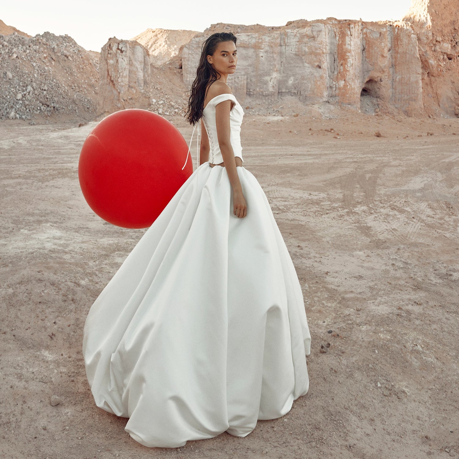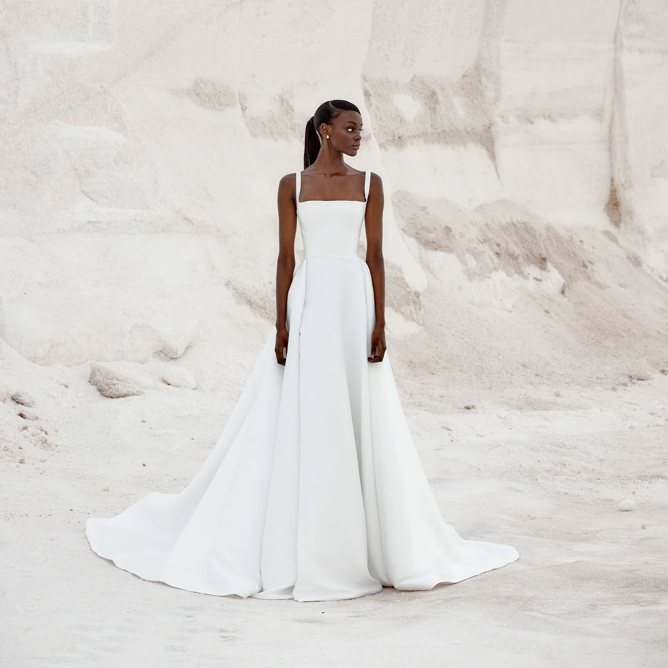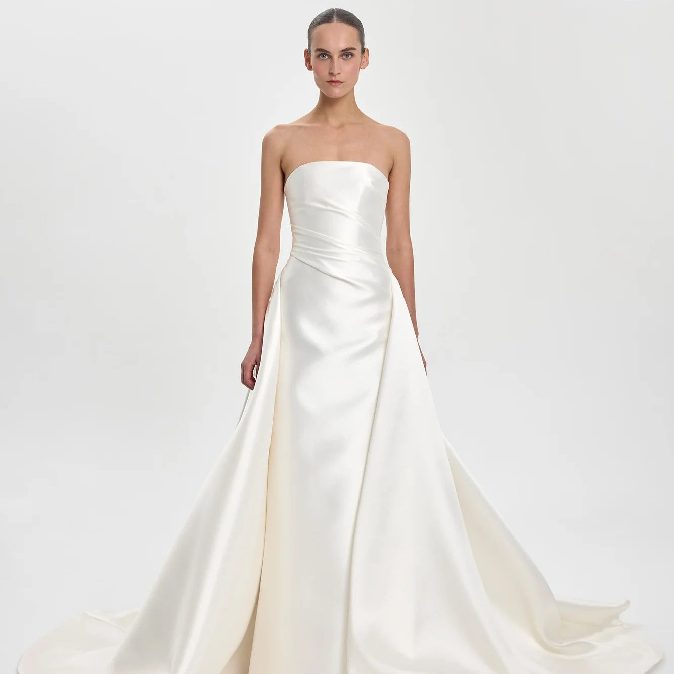 Category is modern 60s icon. You win in Arta, thanks to tulle details over a luxe duchess satin structured silhouette. A square neckline, fitted bodice with delicate straps and gentle fit and flare skirt contrasts perfectly to the softness of tulle sleeves and narrow tulle overskirt, both which are detachable.