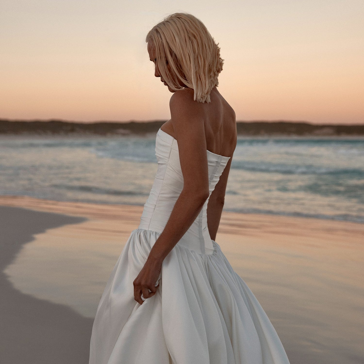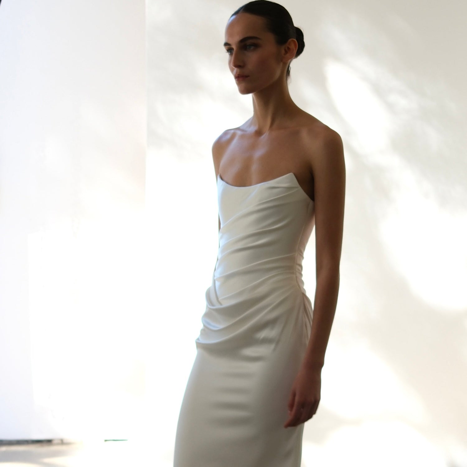 Sunday best becomes your lifetime best, with Sunday, a study in the art of draping. A true celebration of the female form, Sunday's structured bodice and fresh sweetheart neckline cuts an hourglass figure. A luxe, heavy crepe is directionally and effortlessly draped across the body to create a statuesque, shapely silhouette for instant screen siren energy.