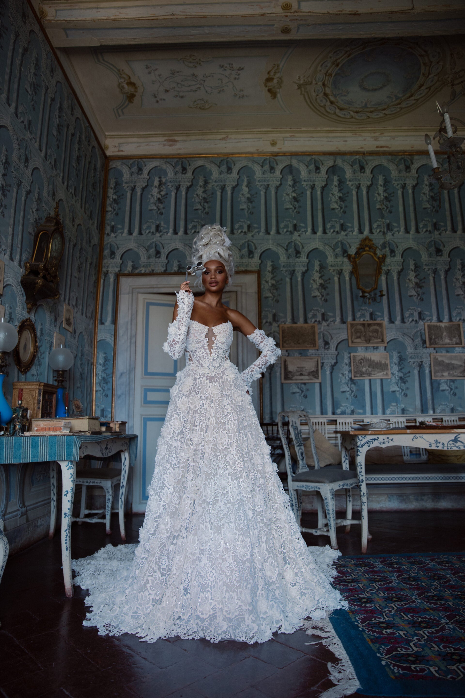 A pointed corset adorned with delicate French lace and intricate 3D elements, paired with a majestic skirt that perfectly highlights the bride’s waist. This gown embodies the dreamy essence of a princess, with a sheer corset and a whimsical arrangement of appliqués that add a touch of fantasy.