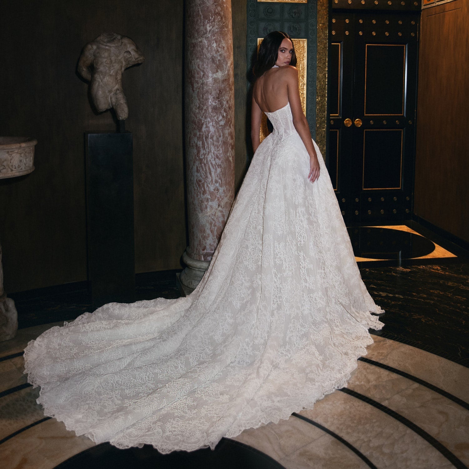 A fully draped corset gown with delicate straps, designed from the highest-quality fabrics. The form-fitting silhouette emphasizes the hips with bold elegance, while the sweeping train leaves a breathtaking impression.