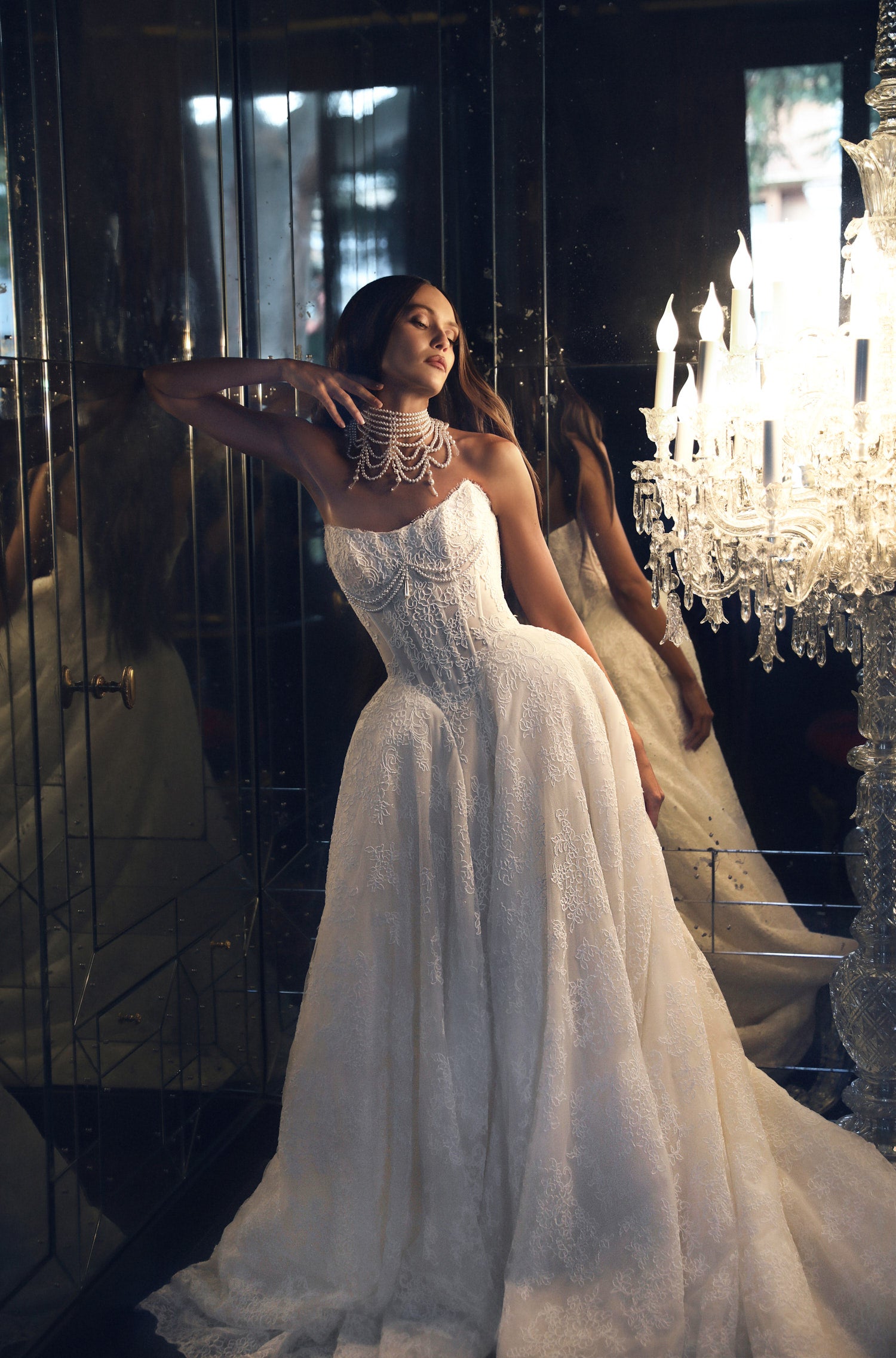 Timeless elegance embodied in a mermaid silhouette, enhanced by an additional ball gown skirt, adorned with lace, and cinched at the waist. The lowered corset, both front and back, is a signature of The Diva. Refined French lace, paired with a modern, elegant cut, gives Charlie its distinctive character. Delicate straps and a sheer back to the corset enhance the femininity of this design. The Diva Charlie captures the emotions of brides in this era, radiating grace and allure.